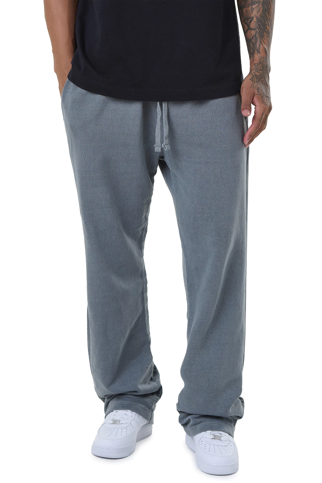 Calça de moletom com modelagem moderna, oferecendo caimento solto e corte reto. Design elegante e despojado. Confeccionada em materiais confortáveis que garantem proteção térmica equilibrada, sem superaquecer, e proporcionam amplitude total de movimentos. Tecido com aspecto desgastado através de estonagem, feito em algodão fio 24/1 e fio 8/1, com gramatura 225 g/m².
